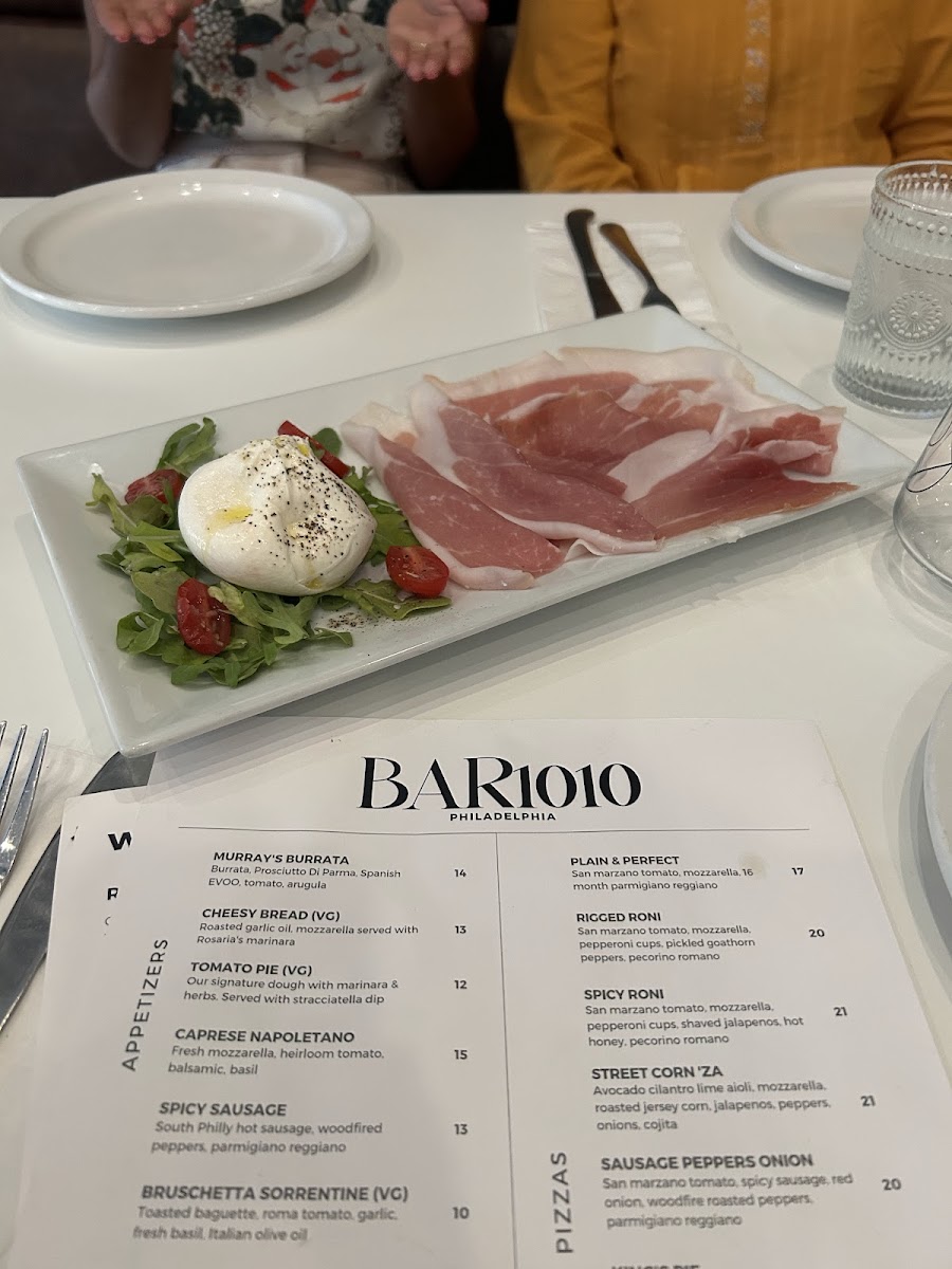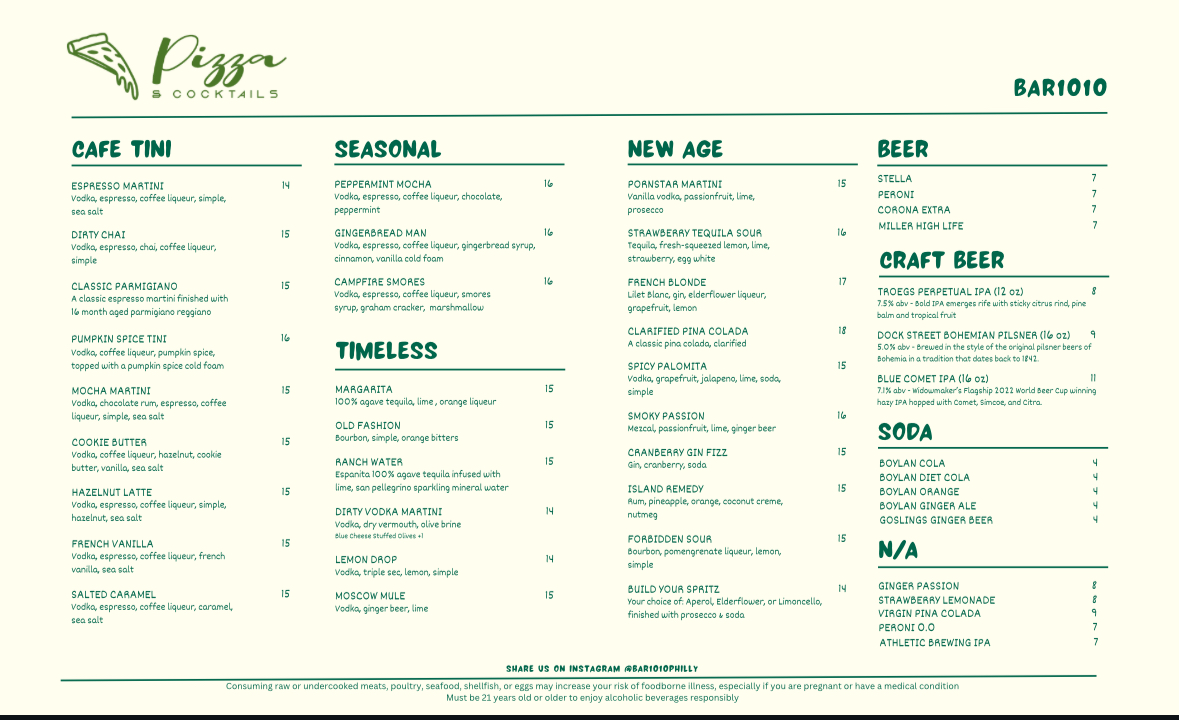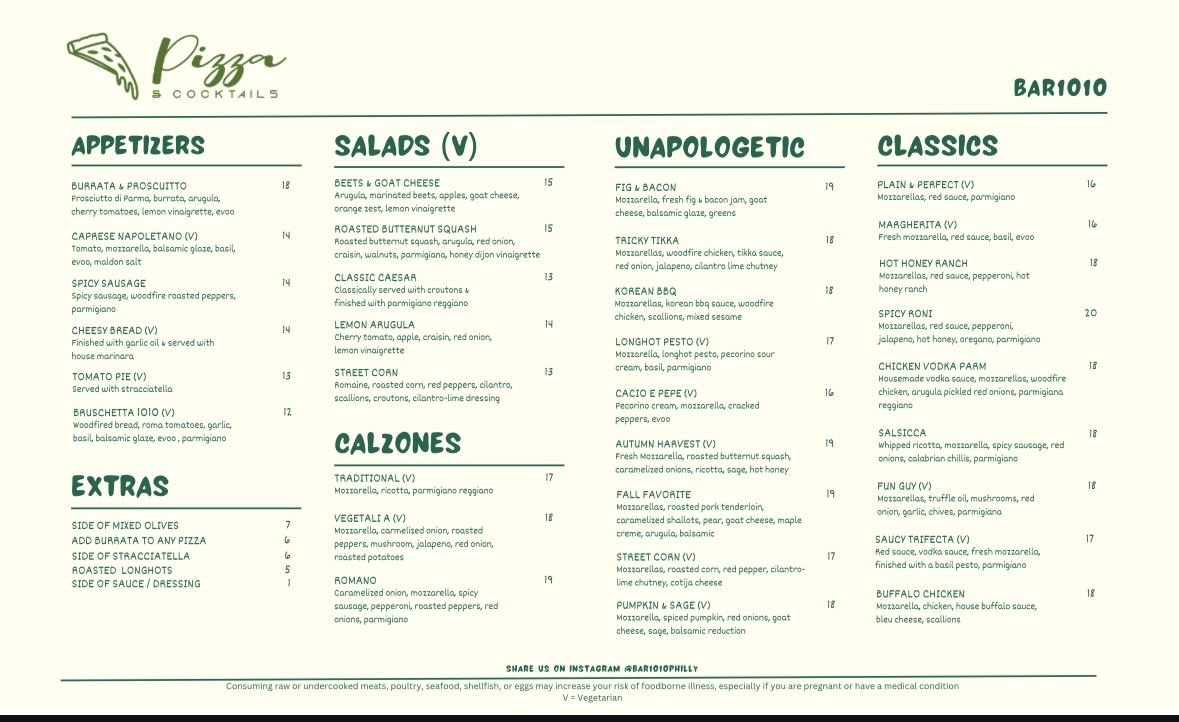 From a reviewer’s perspective, the menu at Bar 1010 offers a well-curated selection that balances simplicity with flavor. The meal can begin with refreshing options like Still Water or Sparkling Water, followed by standout starters such as Burrata & Prosciutto Di Parma, Salsiccia Piccante, Woodfire Cheesy Bread, Thin N Crispy Tomato Pie, and Bruschetta Della Casa, each delivering a satisfying introduction. The salad section, featuring Classic Caesar, Green Goddess, and Beet & Pistachio, provides lighter yet flavorful alternatives. The highlight is clearly the woodfire pizza lineup, where choices like Plain Jane, Fig & Prosciutto, Drunken Bird Tikka Masala, and Salsiccia showcase both traditional and inventive combinations. To round things off, the Lemoncello Cake offers a bright, citrusy finish, while beverages such as Cola, Diet Cola, Orange, and Ginger Ale complement the meal nicely. Overall, the menu feels cohesive and thoughtfully designed, with each category contributing to a satisfying and well-rounded dining experience.